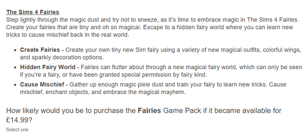 - TomaTeri6 years agoSeasoned NewcomerI'm wondering if we are getting witches and fairies maybe? I don't mind if not, because I want witches, fairies and werewolves all fleshed out as they did vampires. And I don't care in which packs they come as long as they are coming. But this GP is exciting anyways!
