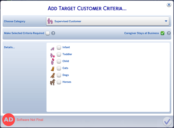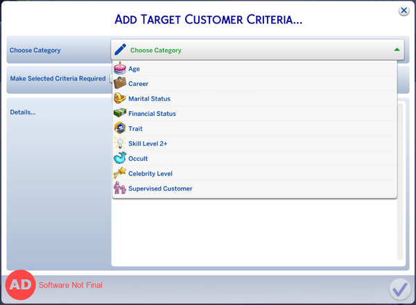 New detail with this pack - the rules can be strict (specifically ONLY these customers) or loose (these customers preferred, but other Sims also welcome). So you could have a business ONLY attract Teens, but might run out of new customers quickly unless you create more Teens, or they are spawned via other gameplay. Preferring Teens usually spawns Teens until the save runs out, then calls in other customers to make up numbers.