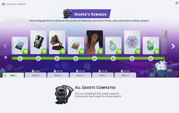 The Event will run for eight weeks, with two exciting Quests each week. Your journey begins by assisting Grim with researching Ambrosia, a special Gourmet dish that can lift any Sim’s spirits. As the weeks progress, you’ll continue to unlock the secrets of Ambrosia and eventually learn how to cook it! The more Quests you complete, the more Event Points and rewards you’ll earn.