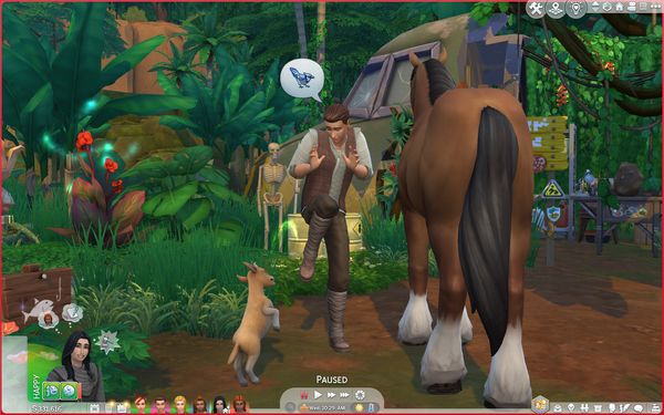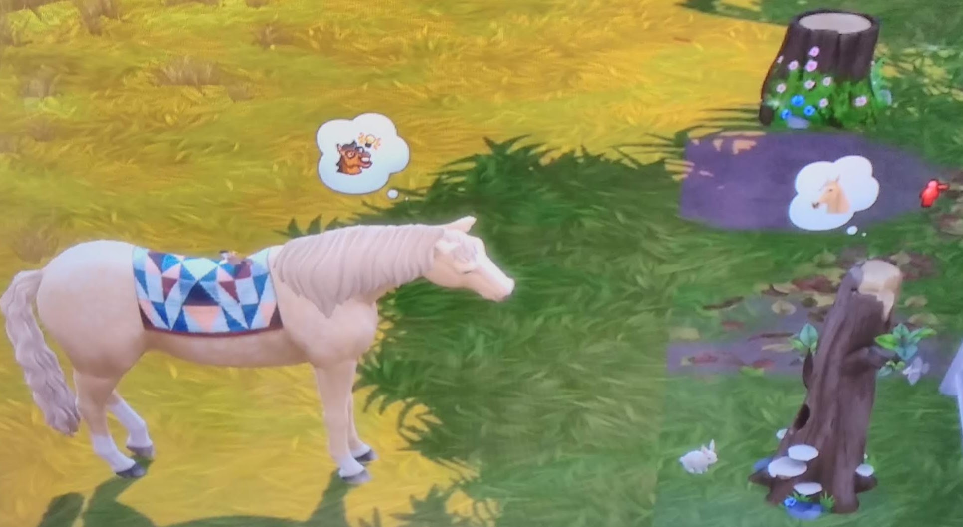 Here's an image of Buttercup from last year. She was the first horse to discover she could communicate with wildlife. She was absolutely not impressed and so began the battle of horse vs birds in my game. If there's a wild bird tree I can guarantee the horses will be inexplicably drawn to it and I only wish I knew what they were saying to each other. All I can tell is that it does not appear to be friendly from the looks of all the red minus signs around them and a look on each horse's face that appears to say "how very dare you!"