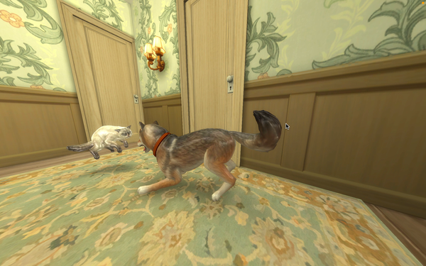 Vincent and Chester, Lynx Point Siamese and a Coyote, playing in the stairwell upstairs, while the family is sleeping.