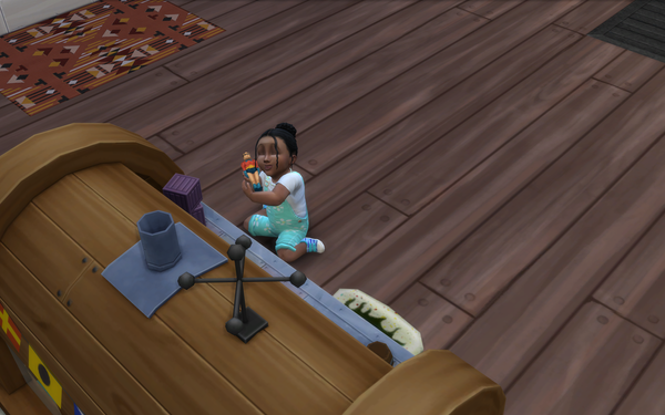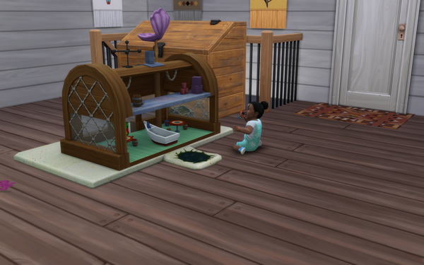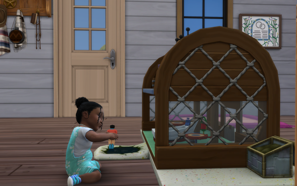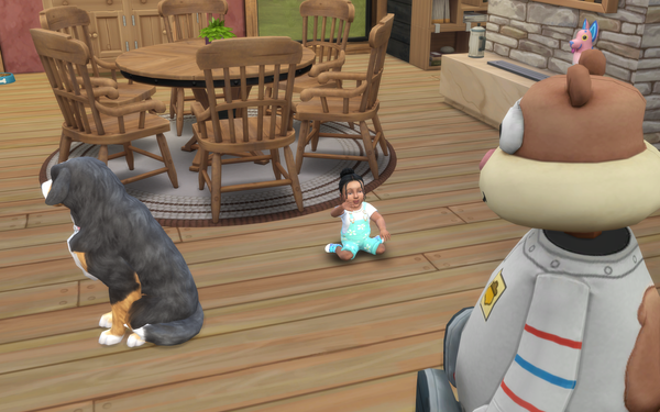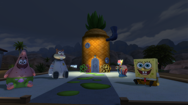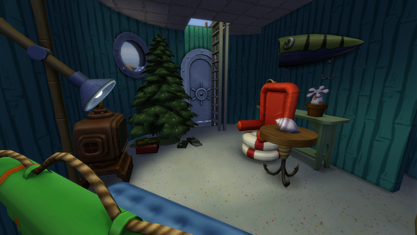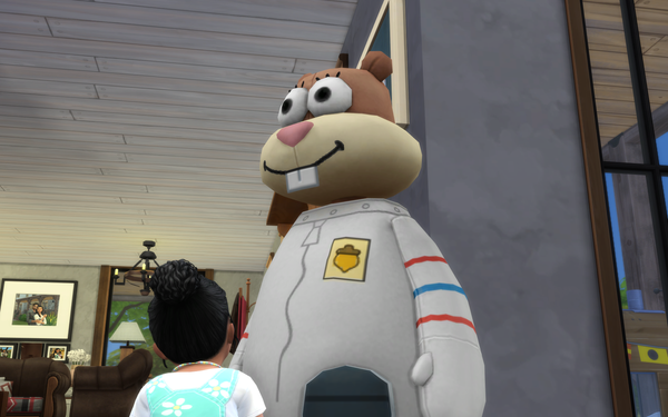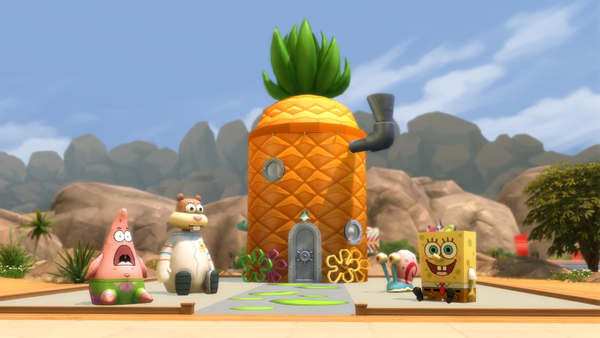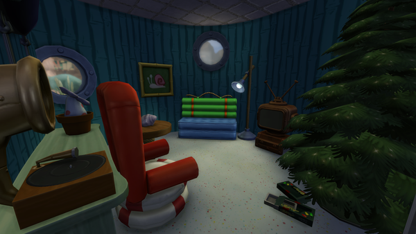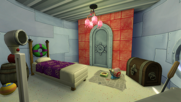 The pineapple themed SpongeBob house looks great! ๐ The exterior design is great and the large plushie characters look good on the front patio area. Very nice furnishing of the bedroom and living room with the kits items. Your sim may get woken with a surprise by the new foghorn alarm clock near the bed!