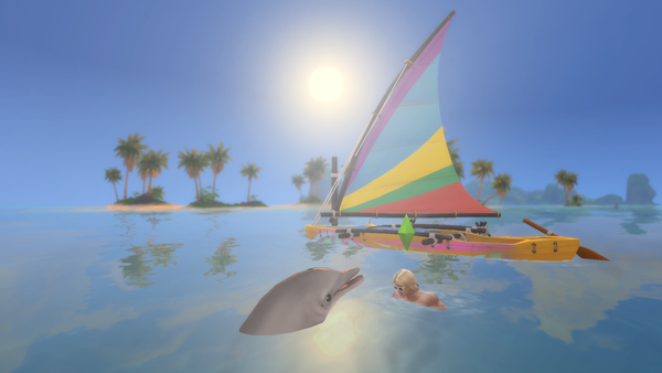 It is a very lovely photo of Sulani! ❤️The blue skies, shining sun and restful palm trees are very nice! The dolphin is sweet 💗It looks very peaceful. I hope that your sim goes well as a lifeguard.