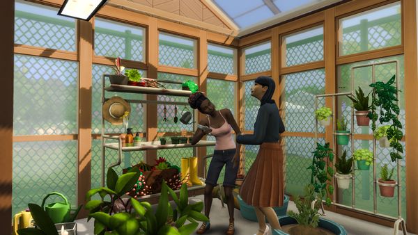 It is a lovely picture of the ladies enjoying chatting in the greenhouse 🙂The greenhouse is very nice! The plants and shelving are lovely. It looks a nice sunny day.