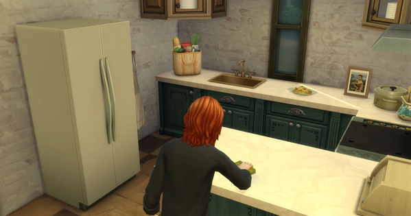 It is great that she is a neat sim and was cleaning the counter. The family photo on the kitchen counter of your sim holding his pet is sweet and special โค๏ธ It is lovely for the family to see whilst preparing meals.