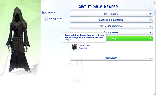 My single sim has no shame in her Grim game, but for some reason, someone wanted to make it a scandal. I like that for us. Also, Grim's profile also says the same "He is in love with the Grim Reaper" which I thought was funny.