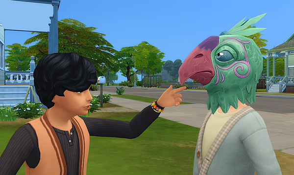 Meanwhile Poe looks a little sceptical. That's just cardboard, yes? His neighbor hasn't really transformed into a monstrous bird?! (He got gifted a mask of his own right after this screenshot.)