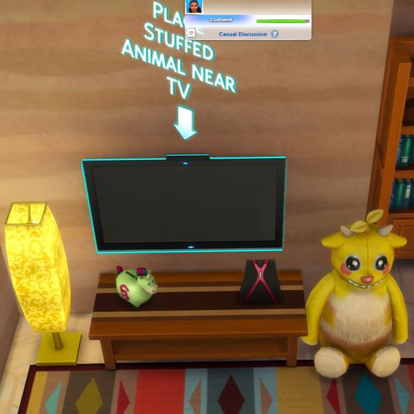 The second quest starts off with: eat something, ask the toy a question, and use the toilet. There's a glitch where any sim can eat something, but the game will attribute the action to whoever you're controlling atm. So while my sim's brother ate something, the game said my sim ate it. The whole part about asking adults for advice and coming up with a plan is cute. Nothing particularly interesting or creative, but at least there's something of a story to follow. It's an improvement over previous events in that way. Sort of.