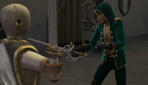 Odin looks great with his eye patch, royal crown and his regal outfit! 🙂The black and gold colours are great. I hope that his building up of his swordsmanship skill goes well!