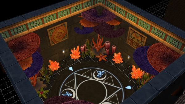 Present-Day Islanders know very little about these ruins or the nature of the glowing glyph on the second floor of the ruins. There is no indication of a power source or an explanation for how the glyph is glowing. Glyph on the interior of the temple depict Chaos, Fire, and Vigilance. The Glyphs of Chaos alongside the Glyphs of the Watcher seem to indicate the purpose of the ruins. Archeologists theorize that the ruins was a kind of outpost used to observe the Volcano up close, especially since it was built from material that could better survive a Volcanic Eruption. The surroundings of the ruins are in decline like the rest of Mua Pel'Am. Historians have learned that the current state of the ruins came just before the decline of Mua Pel'Am as an island. The volcanic smog and declining life around the islands and in the ocean is a concern to island conservationists, but undoing the damage the island has sustained has been a long process that has yielded very few positive results.