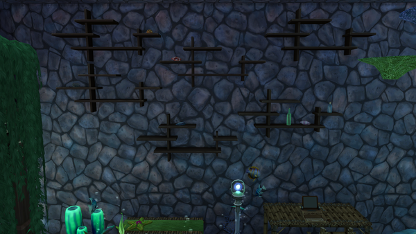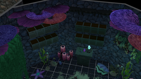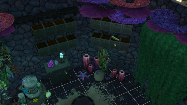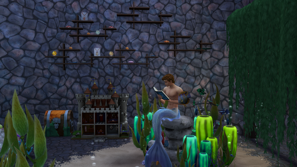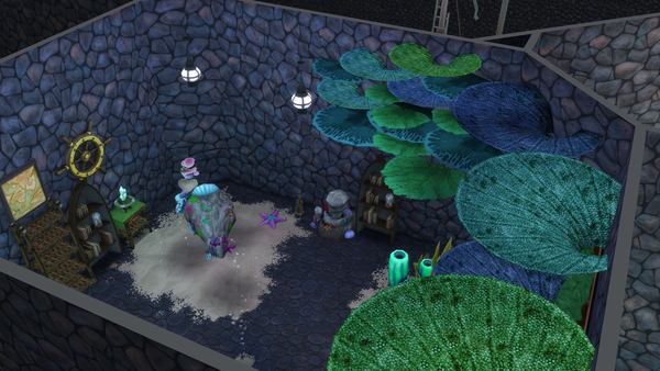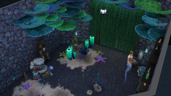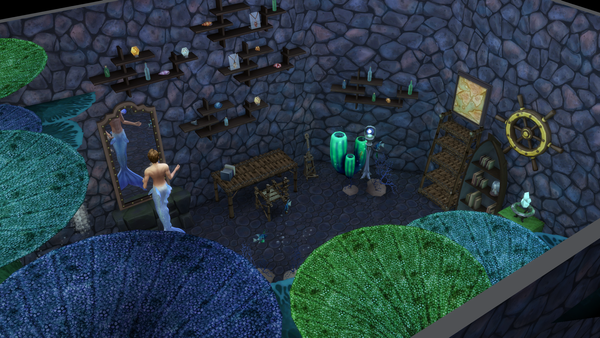I expanded this grotto by adding decor. Additional shelves allow for displaying sunken treasure and seashells. This is the grotto where the Zalrian Pod will eat and cook meals. I'm pretending that the "Messages" in a Bottle are another way for my merfolk to store notes they write. In this grotto, the notes in the bottles are the equivalent of human cookbooks and contain mermadic recipes. There are no utilities that use fire because fire doesn't burn underwater. Should also be worth noting that not all merfolk in my story have the power that would make cooking with heat possible.
