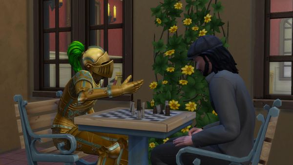 It is a great photo of your sim enjoying playing chess with the knight! 🙂I hope that he won the match!