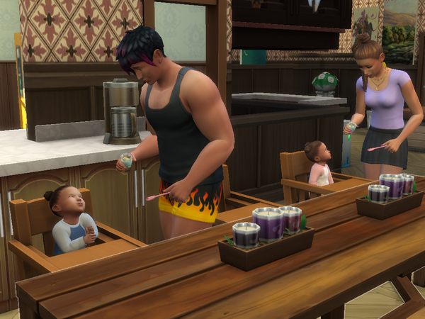 Arthur managed to make progress writing another children's book, but today was mostly about taking care of everyone's needs again. The girls continued to explore new foods. Coralina (right, in pink) seemed unsure about almost everything, while Celestina (left, in blue) wasn't unsure about much, and either liked or disliked the foods she tried.