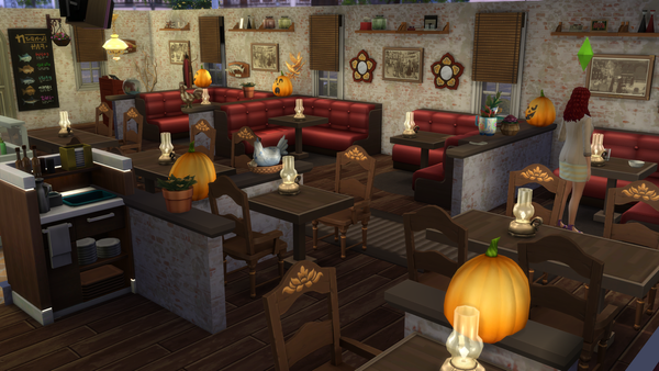 The Old Farmhouse is a lovely restaurant @graceymanors 🙂 The design, layout and furnishing is very nice. Very lovely seating for sims to enjoy eating meals. The pumpkins are nice through the room. I hope your sim’s first dinner service goes well.