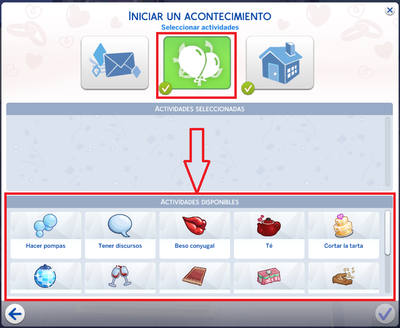 Si estoy entendiendo bien, aunque ahí en tu imagen marque eso de actividades en realidad donde debes elegirlas es dando a la flecha de abajo a la derecha para continuar, en la siguiente ventana, en el icono de los globos.