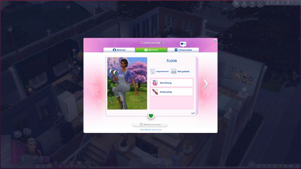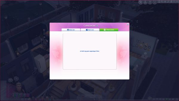 Als ik Cupidohoek open krijg ik matches van sims. Als je een sim leuk vind dan moet die die aan je opgeslagen sims toe voegen. Maar dat lukt niet. Als ik op het hartje klik, krijg ik bovenaan wel de melding dat er iemand aan mijn opgeslagen sims is toegevoegd maar bij het openen van mijn opgeslagen sims vind ik niemand terug en staat het hartje nog altijd bij de sim dat ik leuk vind. Ik weet dat er vroeger opgeslagen stond waar het hartje zich bevond.