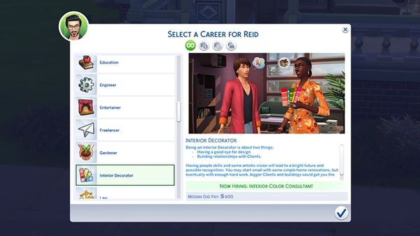 - Konsultant ds. dekoracji wnętrzNagrody zawodowe i nowe interakcje:600 simoleonów, interakcja „Rozmawiaj o najnowszych trendach”