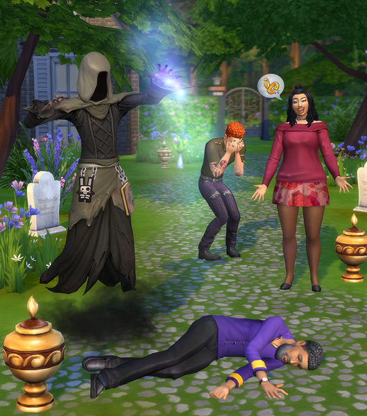 • Sims vão reagir de forma única à morte dos outros com base em traços e relacionamentos. Vivencie de tudo, desde chorar por uma pessoa amada falecida a vomitar por causa da morte de um estranho.