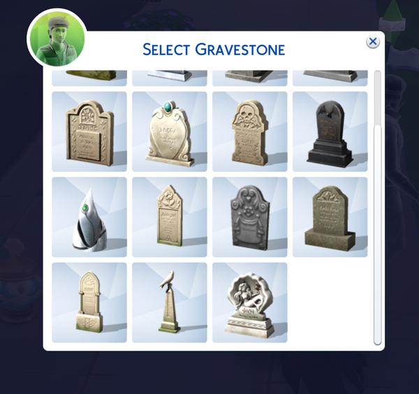 • Se você tiver Ao Trabalho (Alienígenas), Vampiros, LobiSims, Reino da Magia (Feiticeiros), Ilhas Tropicais (Sereias) ou o futuro Pacote de Expansão Pé na Cova, poderá clicar na urna ou lápide de um Sim para escolher uma lápide para usar. sabe aquele Sim que não era um Vampiro, mas era um pouco obcecado demais com Vampiros? Pois é, agora ele pode descansar eternamente com uma lápide de morcego.