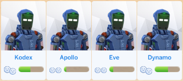 Example picture of my sim's Servo friends. These four Servos are all auto-generated and all blue+red.