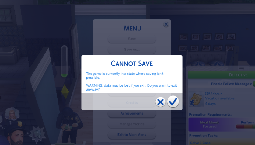 My sim was in labor when I was controlling my other sim while he was on detective duty, I switched to the female and had her go to the hospital alone and when she was done and home with the baby I switched back to my other sim to finish his shift. Now he's home and I'm unable to enter build mode as the game is still considering that my sim is still in fact giving birth when she's indeed for sure not giving birth and they can interact with the baby. It won't let me save my game to restart and I can't do anything else.