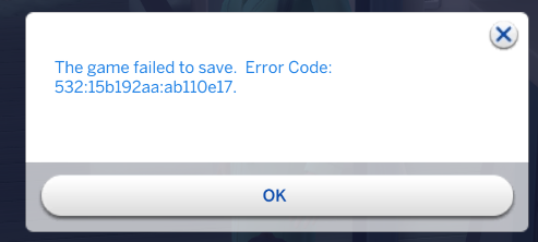 Recently, I have been unable to save in the current household I am playing. The save has been going for 5 generations in sims time and I’m not able to save my progress. Once in a while, I will be able to save if I save 30 seconds into gameplay and then all of the other saving actions work. I have gotten rid of some mods I think are causing it and some cc objects, it seems to work for a little bit. I don’t know if it was the saving soon after opening or getting rid of the mods, but it always comes back to a point where it won’t save at all. The error code that pops up says "The game failed to save, Error Code: 532:66914ffc:e32cd209"
