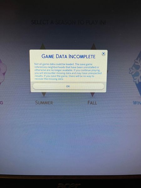 Hello, I logged onto my desktop play the Sims 4 today and it gave me the message 'Game Data Incomplete' when I hit play. It told me that the game was referencing neighborhoods that were missing or un...