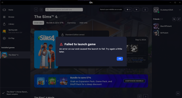 hello i dont know how to fix this, i have tried everything but every time i go to load up the game it comes up with an EA error and it says An error on our end cause the launch to fail. Try again a little later, but i wouldnt let me in all day yesterday and it is still happening, can some one help me please