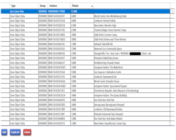 Everything below that in the picture is actual lots and you can see how you are paying for the lots you are using in your game, I've got 4 lots over 2MB, which is pretty good, with Von Winterburgh Estate being my highest at 2.6 MB and this is a EA Based lot. In your own save have you got to many above 2.0MB? If the answer is yes, you might wish to consider removing some of them lots, possible for smaller lots. I can't give you any hard rules on this, but if you have had any corruption problems, if you have 20+ 2MB size lots it's probably to high. On the right side it tells you where the lot is should you need to amend any, which you can do inside the game.