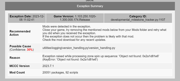 <report><version>2</version><sessionid>3d8aec9002b2843065735dab</sessionid><type>desync</type><sku>ea.maxis.sims4_64.15.pc</sku><createtime>2023-12-08 10:38:28</createtime><buildsignature>Local.Unknown.Unknown.1.103.250.1020-1.300.000.174.Release</buildsignature><categoryid>developmental_milestone_tracker.py:1107</categoryid><desyncid>3d8aec9002b2843065735dab</desyncid><systemconfig/><screenshot/><desyncdata>Exception raised while processing zone spin up sequence: 'Object not found: 0x2a1d81eb' (KeyError: 'Object not found: 0x2a1d81eb') Traceback (most recent call last): File "T:\InGame\Gameplay\Scripts\Core\sims4\utils.py", line 179, in wrapper File "T:\InGame\Gameplay\Scripts\Server\areaserver.py", line 222, in c_api_server_tick File "T:\InGame\Gameplay\Scripts\Server\sims\masked\v48\injector.py", line 26, in _wrapped_function File "T:\InGame\Gameplay\Scripts\Server\sims\masked\v48\zone_tick.py", line 83, in _turbolib_zone_game_update File "T:\InGame\Gameplay\Scripts\Server\zone.py", line 509, in update File "T:\InGame\Gameplay\Scripts\Server\zone_spin_up_service.py", line 1677, in update File "C:\TS4Scripts\Improved_Autonomy_During_Loading_Screens.py", line 202, in on_update File "T:\InGame\Gameplay\Scripts\Server\zone.py", line 738, in on_hit_their_marks File "T:\InGame\Gameplay\Scripts\Server\zone.py", line 1126, in _set_zone_state File "T:\InGame\Gameplay\Scripts\Core\sims4\callback_utils.py", line 158, in __call__ File "T:\InGame\Gameplay\Scripts\Server\developmental_milestones\developmental_milestone_tracker.py", line 1196, in send_all_milestones_update_to_client File "T:\InGame\Gameplay\Scripts\Server\developmental_milestones\developmental_milestone_tracker.py", line 1107, in _get_milestone_update_msg KeyError: 'Object not found: 0x2a1d81eb'rtim=0 Client Session Time: 320.03 Num Save Errors: 0 Num Load Errors: 0 Current Game State: 0x96d01090 LoadingScreenActiveFlag: 1 Origin Version: 13,74,0,5587 Modded: True SystemInfo: Windows 11 10.0.22621 GPU: NVIDIA GeForce RTX 3060 nvldumdx.dll 31.0.15.3713, GUID: D7B71E3E-6643-11CF-197D-7CE90EC2D235 </desyncdata></report>