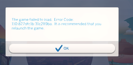 - Tried starting the game with mods enabled, but without the mods folder, deleted all cache files before loading. Tried loading into the family. Still won't load and gives me an error code (see below).