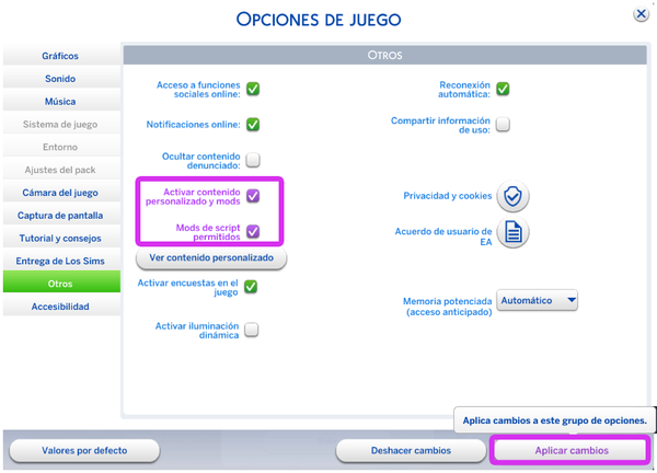 Si instalas Mods y/o CC, que altera el comportamiento del juego, sera necesario que habilites los mods de script en tu juego para que funcione. Para ello: