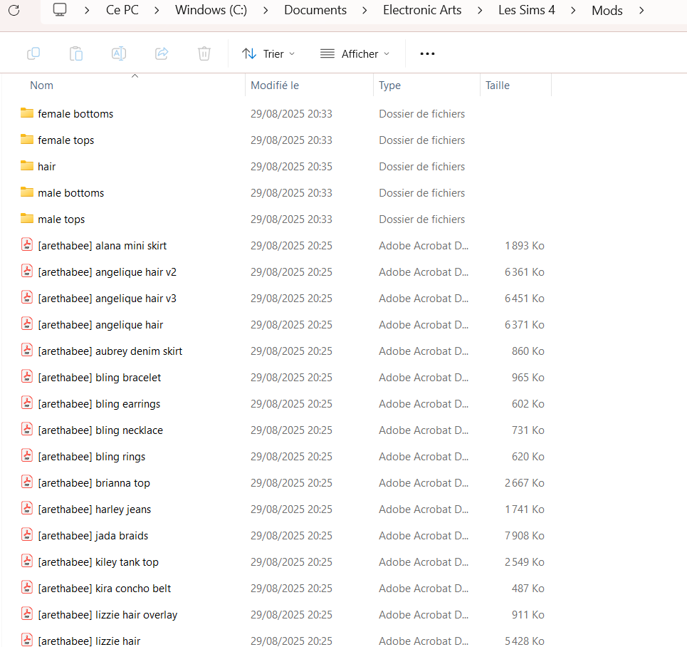 J'ai fait énormément de manipulation depuis hier en essayant de trouver le problème. Au départ je pensais que c'était un problème de stockage donc j'ai désinstallé et réinstallé le jeu sur Windows C:, et depuis plus rien ne fonctionne. J'ai essayé de mettre les mods sur le dossier personnel, dans le dossier sur Ce PC, j'ai vidé les cache/cachestr ect, j'ai retiré les sous dossiers inutiles, j'ai tout décompressé, j'ai suivi absolument tous les tutos. Toutes les options sont bien activées dans le jeu pour prendre en compte les mods et la modification des scripts mais rien. J'avoue avoir désinstallé le jeu plusieurs fois parce que je ne retrouvais même pas le dossier des mods qui est censé être sous Documents/Electronics Art/Les Sims 4. Je n'avais que le dossier Les Sims 4 avec les fichiers EP.
