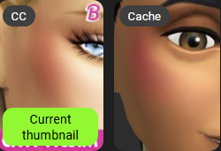 Du coup j'ai des vignettes de CC pas très ouf, où je ne voie plus les créateurs et les réelles détails du CC (c'st quand même moins ouf pour les eyeshadows, lipstick...). Je mets une image avec un CC dans Sims 4 Mod  Manager et celle que je voie dans le CUS, fichier cache.