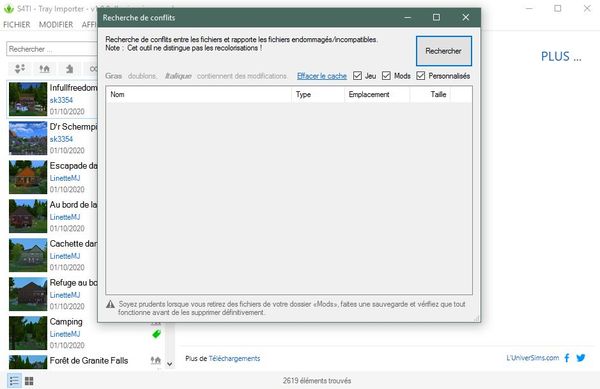 Il existe un outils(Sims 4 Tray Importer) qui permet d'extraire ou d'importer du contenu Sims 4 (Maisons, Terrains, Sims ou Pièces) depuis ou vers votre bibliothèque, et parmis les diverses fonctionnalités de cet outils il a une option de Recherche de conflits.