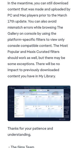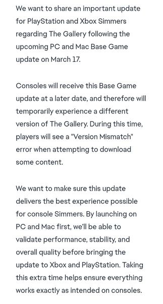 Platform parity. Console players should receive updates alongside PC/Mac to ensure Gallery compatibility and a stable gameplay experience.
