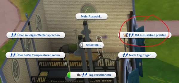 Der Lot-Trait erzeugt das 2malige Auftauchen der Konversation Mit Luxusleben prahlen unter Freundlich > Smalltalk. Zumindest, soweit ich das eruieren konnte, wenn der Gesprächsführende Sim das Merkmal Materialistisch hat und das Gespräch zwischen 2 Haushaltsmitgliedern geführt wird: