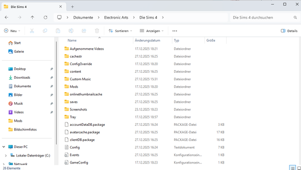 Falls nicht angezeigt wird, folge den Tipps von DarkLady1979 und erstelle einen neuen Sims 4 Ordner und benenne den alten zuvor in Die Sims 4-ALT um. Starte das Spiel, ein neuer "Die Sims 4 Ordner" wird erstellt.
