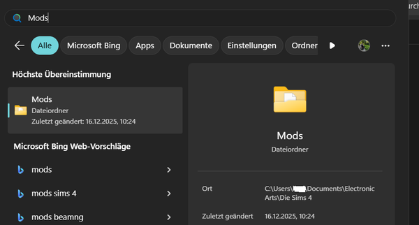 Danke chantistp für den Screen und den Versuch mit einem neuen Mods Ordner. Hast du eigendlich schon mal die Suche Funktion versucht unter Win 11? Drücke auf Start und gebe oben in die "Sucheleiste" Mods ein. Siehe Foto...