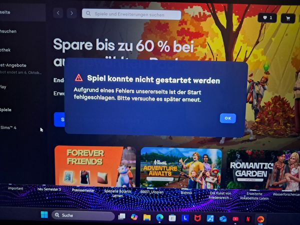I bought the new Sims 4 expansion "Adventure in the Park" on Sunday, along with three other sets. I specifically bought a gaming laptop for Sims 4 last week and had already played on it before, but since Sunday, the game hasn't started. I immediately get an error message. Unfortunately, this hasn't changed in the last few days.