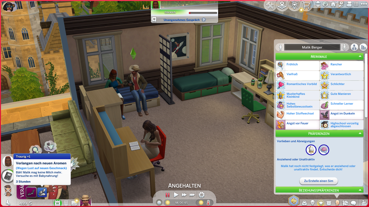 Mein Sim hat regelmäßig die traurige Stimmung "Verlangen nach neuen Aromen" und ich solle es statt mit Milch mit Babynahrung versuchen. Das passt schon längst nicht mehr zur Altersstufe und dieser Bug besteht schon seit er kein Säugling mehr ist. Aktuell ist mein Sim junger Erwachsener, aber es wurde mir bei ihm auch schon als Kind und Teenager angezeigt. Vielleicht hat ja noch jemand diesen Bug.