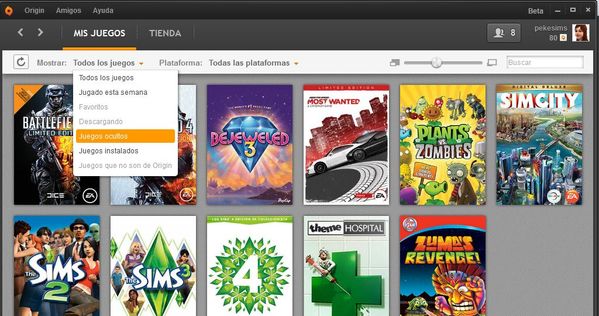 Si aún así no aparece, fíjate que debajo de "Mis juegos" hay un desplegable junto a "Mostrar:". Selecciona "ocultos" para asegurarte de que el juego no está escondido ahí. Si lo encuentras no tienes más que hacer click derecho sobre la carátula del mismo y elegir "Mostrar" para que vuelva con los demás.