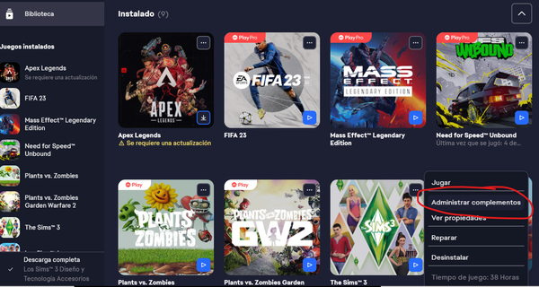 Intentemos lo siguiente @Krocita. Solo para comprobar en la EA App anda a tu biblioteca, busca Los Sims 4 y dale a los 3 puntos que aparecen en la parte superior derecha. Una vez ahí, elige Administrar complementos y asegúrate que aparece el Kit descargado.