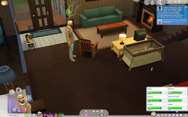 Juego sin mods y sin CC. El problema en cuestión: recientemente, mi sim dejó su empleo. Desde ese momento las necesidades de mi sim aumentan sin estar haciendo nada que las satisfaga. En esta imagen se puede ver como el Hambre y la Vejiga están subiendo.