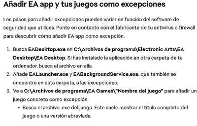 - Añadir EA app y el juego a las excepciones de tu antivirus/firewall y seguridad de vuestro pc, como indican a continuación (no es desactivarlo):