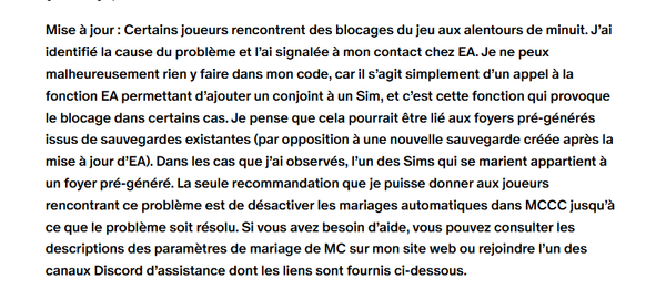 Bonjour, depuis la dernière mise à jour de février, j’ai un problème : dès qu’une journée Sims se termine et qu’il est 00:03 en jeu, le jeu freeze. Je peux toujours bouger la caméra, mais je ne peux plus rien faire. Les Sims répètent leurs actions en boucle et je ne peux plus interagir avec quoi que ce soit. Le jeu refonctionne de lui-même, mais seulement après une quinzaine de minutes d’attente.