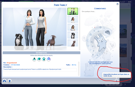 J'ai un problème. J'ai créé ma famille dans les Sims4. Je l'ai enregistrée dans ma galerie, mais lorsque je veux démarrer une nouvelle partie en étant directe...