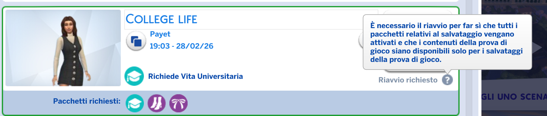A dicembre ho acquistato un pacchetto ("vita universitaria") e due add-on (kit abbigliamento), poi non ho giocato per circa 1 mese, ora che ho rifatto l'accesso mi da errore e mi dice che la partita che ho avviato con l'utilizzo delle espansioni e i pacchetti acquistati non è disponibile perchè non dispongo di questi pacchetti, inoltre accanto al caricamento della partita c'è scritto "avvio richiesto, è necessario il riavvio per far si che tutti i pacchetti relativi al salvataggio vengano attivati e che i contenuti della prova di gioco siano disponibili solo per i salvataggi della prova di gioco", cosa devo fare? Ho speso dei soldi!! Ho già provato a riavviare l'app EA ma non è cambiato nulla.