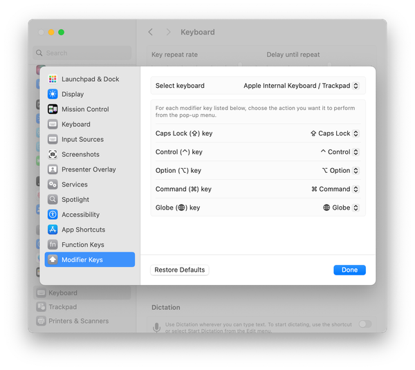 - if the modifier keys have been changed from the default setting in System Preferences/Settings > Keyboard. Apple help page here.