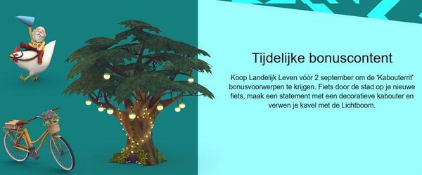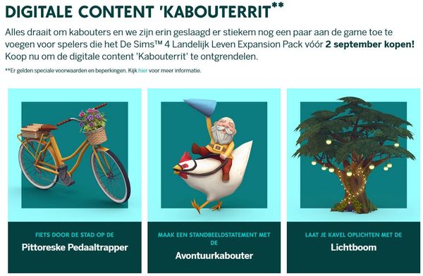 DIGITALE CONTENT 'KABOUTERRIT** Alles draait om kabouters en we zijn erin geslaagd er stiekem nog een paar aan de game toe te voegen voor spelers die het De Sims™ 4 Landelijk Leven Expansion Pack vóór 2 september kopen! Koop nu om de digitale content 'Kabouterrit' te ontgrendelen.